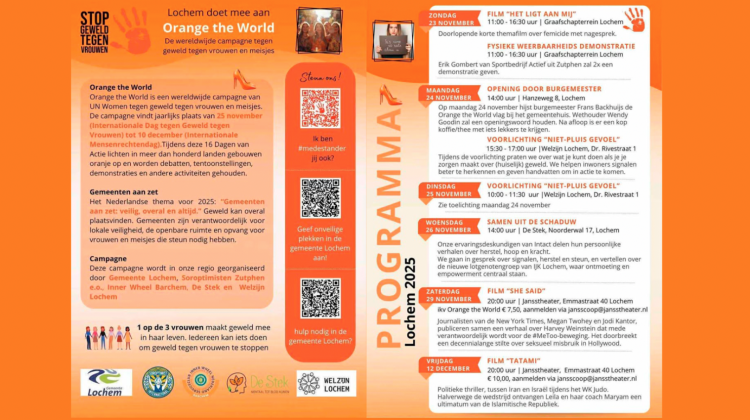 REGIO - De gemeente Lochem doet ook dit jaar mee aan Orange the World, de wereldwijde campagne tegen geweld tegen vrouwen en meisjes. De actieperiode loopt van 25 november, de Internationale Dag tegen Geweld tegen Vrouwen, tot 10 december, de Internationale Mensenrechtendag. Wereldwijd lichten tijdens deze 16 Dagen van Actie honderden gebouwen oranje op en vinden er bijeenkomsten, demonstraties, debatten en andere activiteiten plaats.